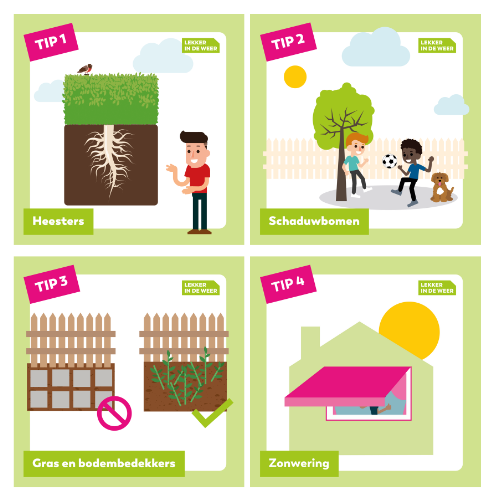 In plaats van beton of tegels kunt u gras of bodembedekkers zoals kruiptijm in uw tuin leggen. Deze houden de grond koeler.